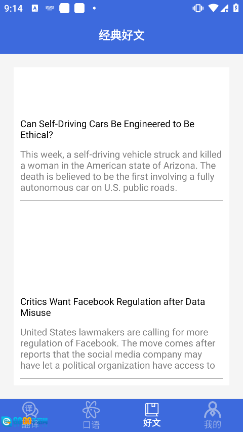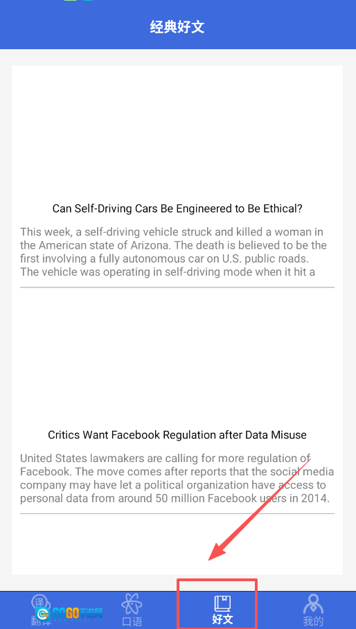 3、之后,到“好文”板块转一转,里面的文章都是节选内容,篇幅较短,很适合每天读一篇来培养语感。