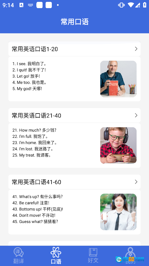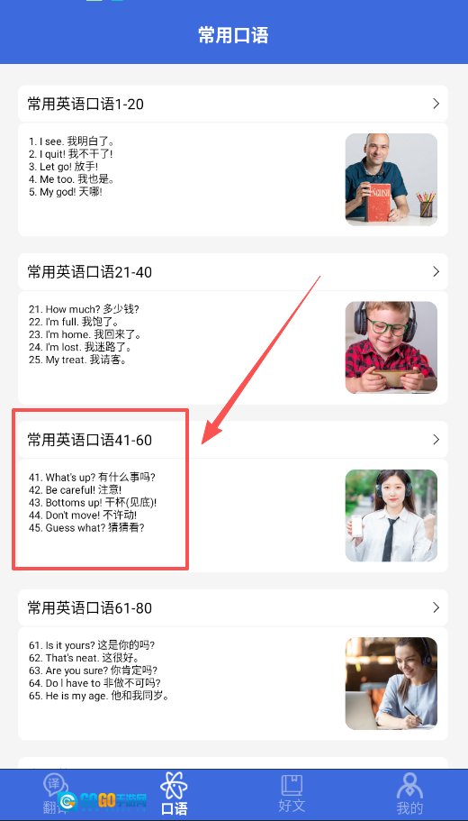 2、接着,你可以点击“口语”标签,里面和单词本类似,罗列着不少日常对话句子,上下滑动屏幕就能逐条进行学习。