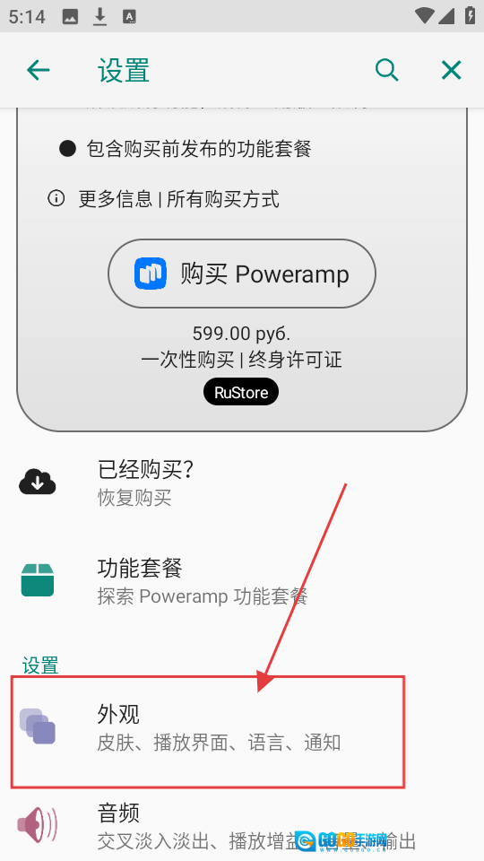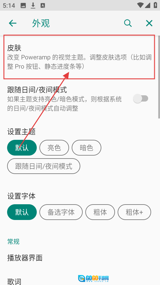 4、进入外观设置页面,点击【皮肤】选项,可改变Poweramp的视觉主题,还能调整皮肤相关选项呢。