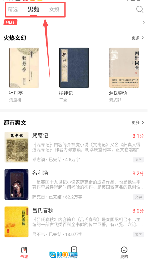 1、首次打开软件,先逛逛书城主页吧。这里按男频、女频和题材分好了类,像热门玄幻里的牡丹亭,或者都市英文里的名利场。