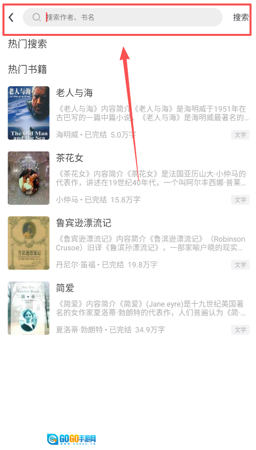 2、想找特定的书,可以用热门搜索功能。页面推荐了老人与海、简爱等经典作品,点击书名就能看到作者和字数等详情。