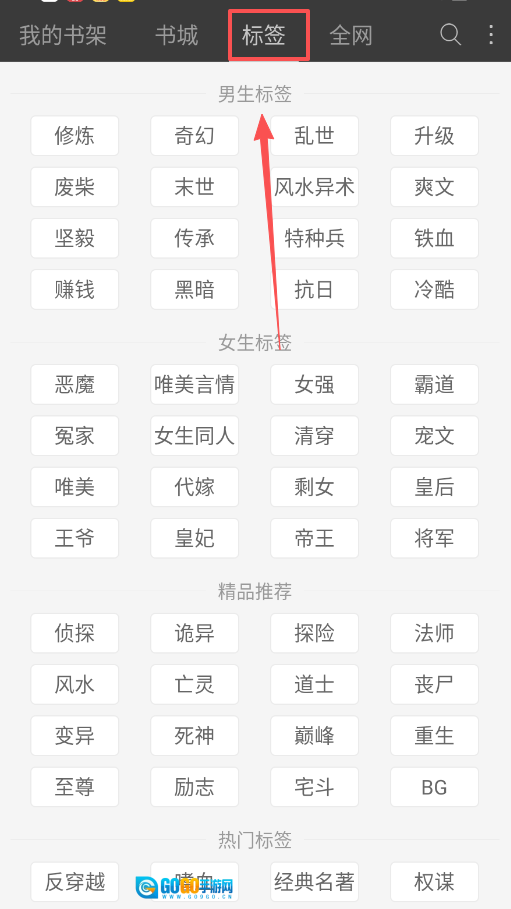 2、要是你希望更精准地查找书籍,可以点击“标签”页面,这里有大量细分标签,涵盖男生、女生、精品和热门等类别。