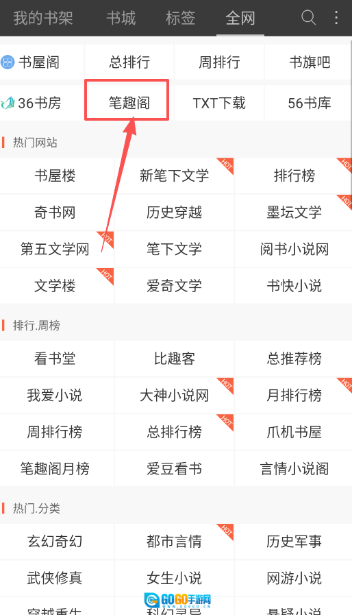 3、在“全网”页面中,该软件整合了众多热门小说网站与资源站,像笔趣阁、奇书网之类的平台都包含在内,同时还设有各类排行榜单。