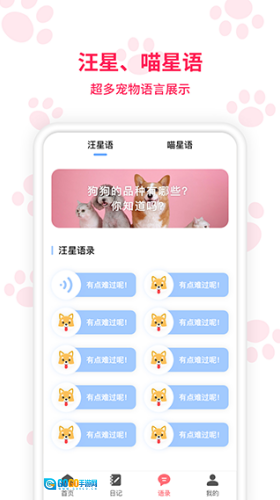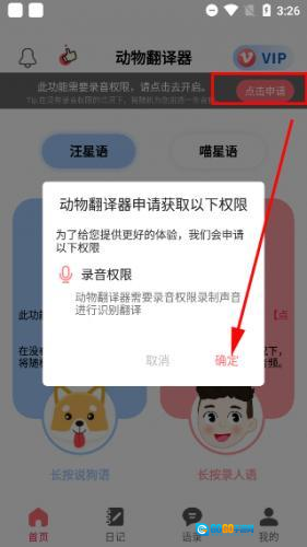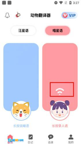 2、在人语框中长按即可录取声音,松开后则会自动翻译成“瞄星语”或“汪星语”,并且自动播放出来。相反的,录制狗狗或猫猫的录音也可将意思翻译成中文。