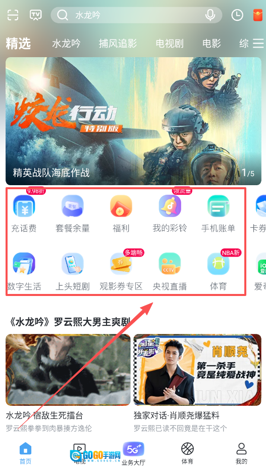 在首页的精选板块,你可以直接追看《水龙吟》这类热门剧集,还能参与9.98折的话费充值活动,同时也能查询套餐余量或者管理手机账单。