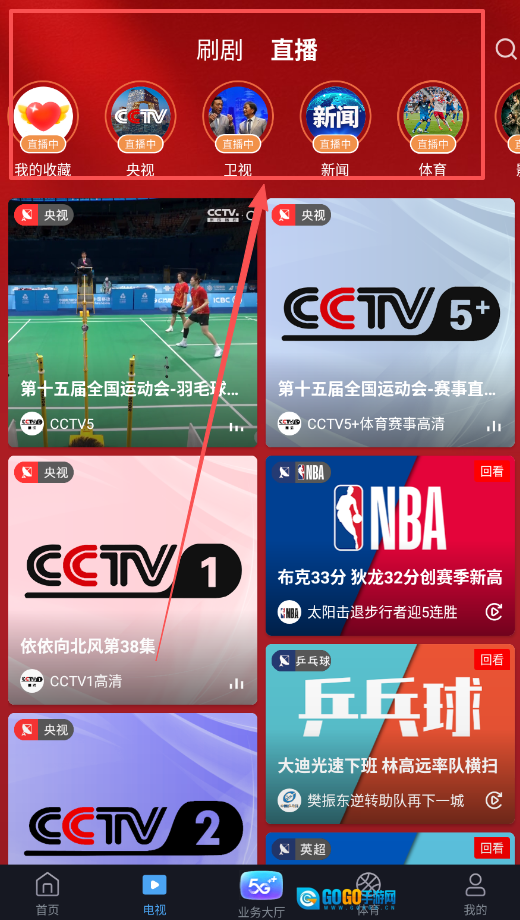 进入电视板块后,顶部设有刷剧和直播两个选项,点击直播选项,即可浏览到央视、卫视、新闻等不同类别的直播频道。