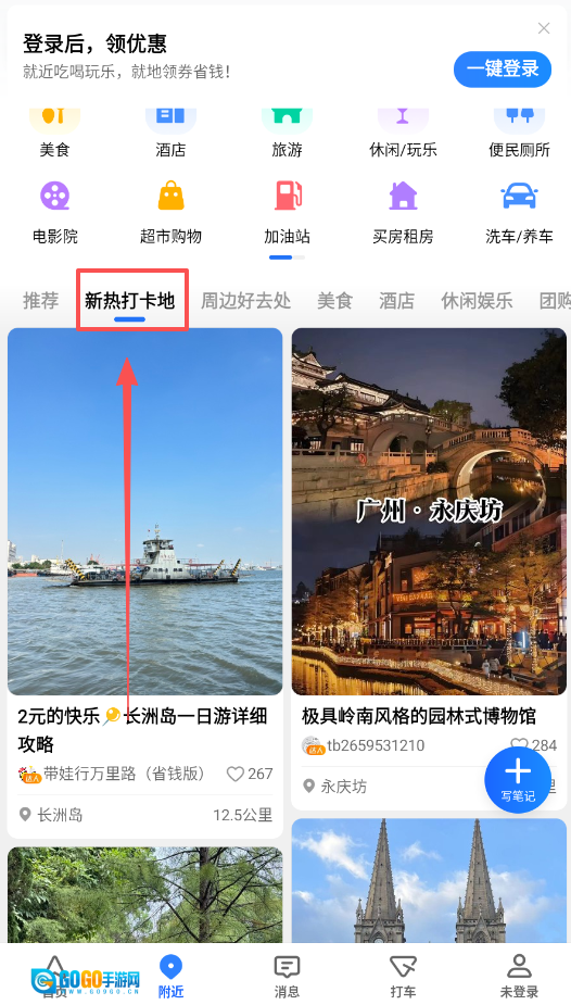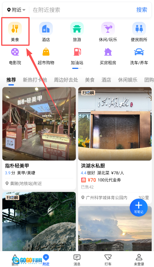 查找周边设施时,进入附近页面即可,该页面聚合了美食、旅游、便民厕所等多种类别,直接点选所需服务就行。