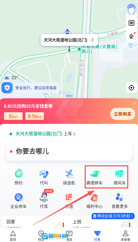 3、规划打车时,输入目的地后,可对比高德拼车、顺风车等不同模式的价格与接驾时间,确定上车点后等待司机接单即可。