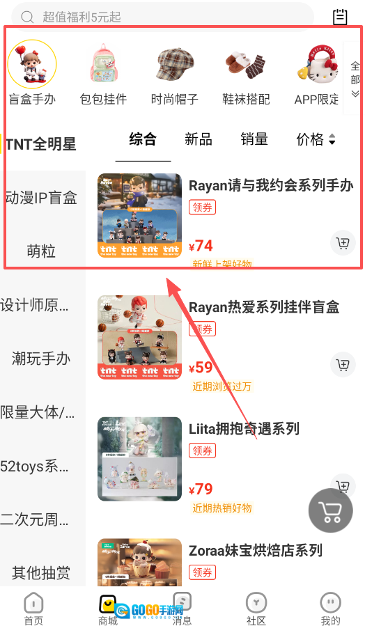 3、若有购物需求,进入商城页面后,能看到盲盒手办、包包挂件等商品分类,还可按新品或销量筛选商品,超值福利5元起,性价比确实很高。