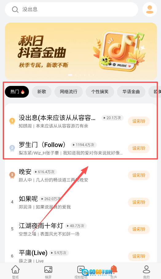 3、要是你平时也爱更换铃声,那就切换到铃声板块看看吧。这里有秋日抖音金曲这类热门分类,像《没出息》《罗生门》之类的歌曲都在其中,能帮你挖掘不少当下流行的音乐。