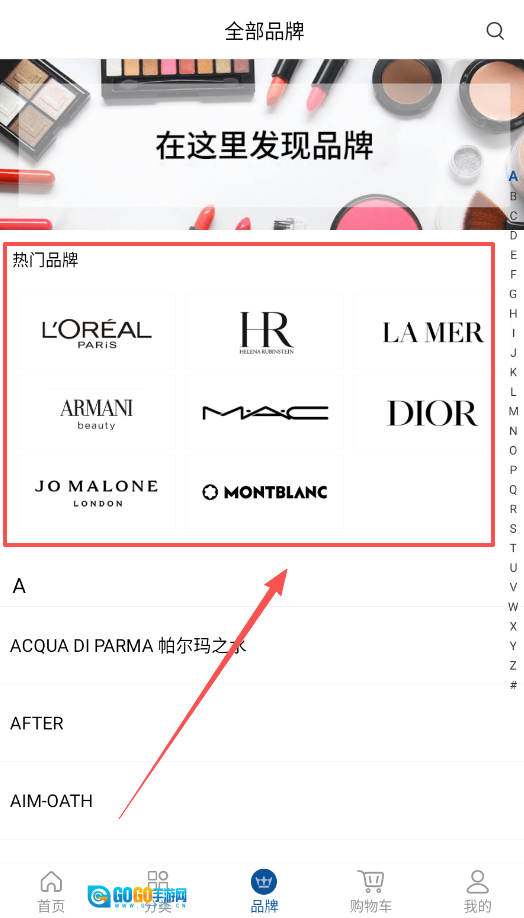 在品牌页面,你可以按照字母顺序筛选,也能直接选择热门品牌,阿玛尼、迪奥这类知名品牌都能快速找到,别忘了留意页面上的汇率换算信息。