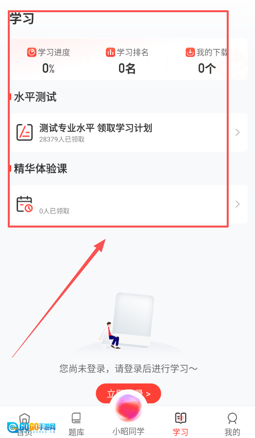 4、学习页面会清晰呈现你的进度与排名情况,若未登录则会弹出登录提示。你可以据此合理规划后续复习安排,让备考过程更具条理。