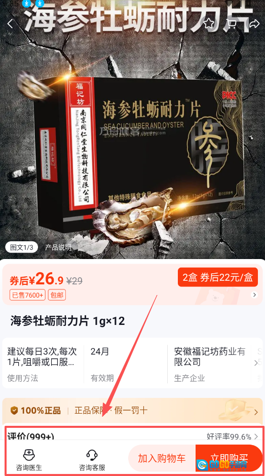 4、在查看商品详情(如海参牡蛎耐力片)时,页面会呈现产品说明、券后价格、销量、使用方法、生产企业等相关信息。