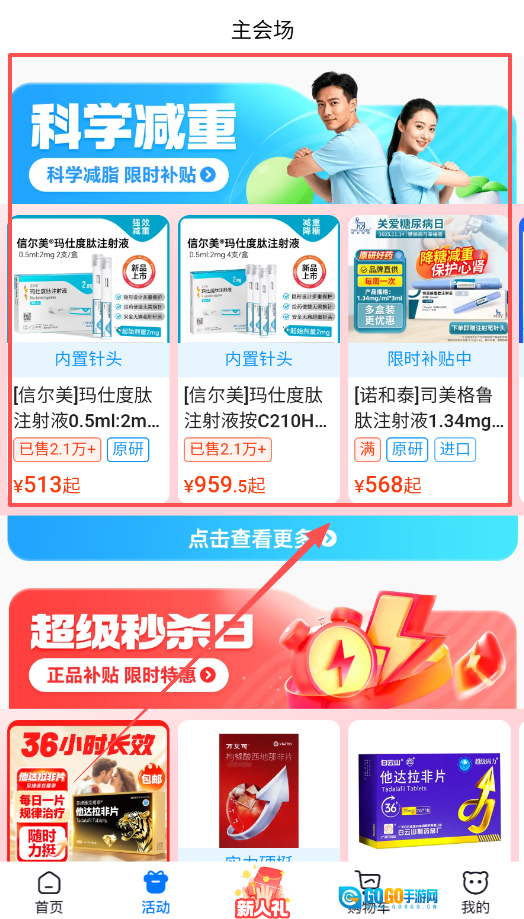 3、若想参与特定活动,进入活动页面后可查看信尔美玛仕度肽注射液等热门商品,便于你快速进行对比并下单购买。