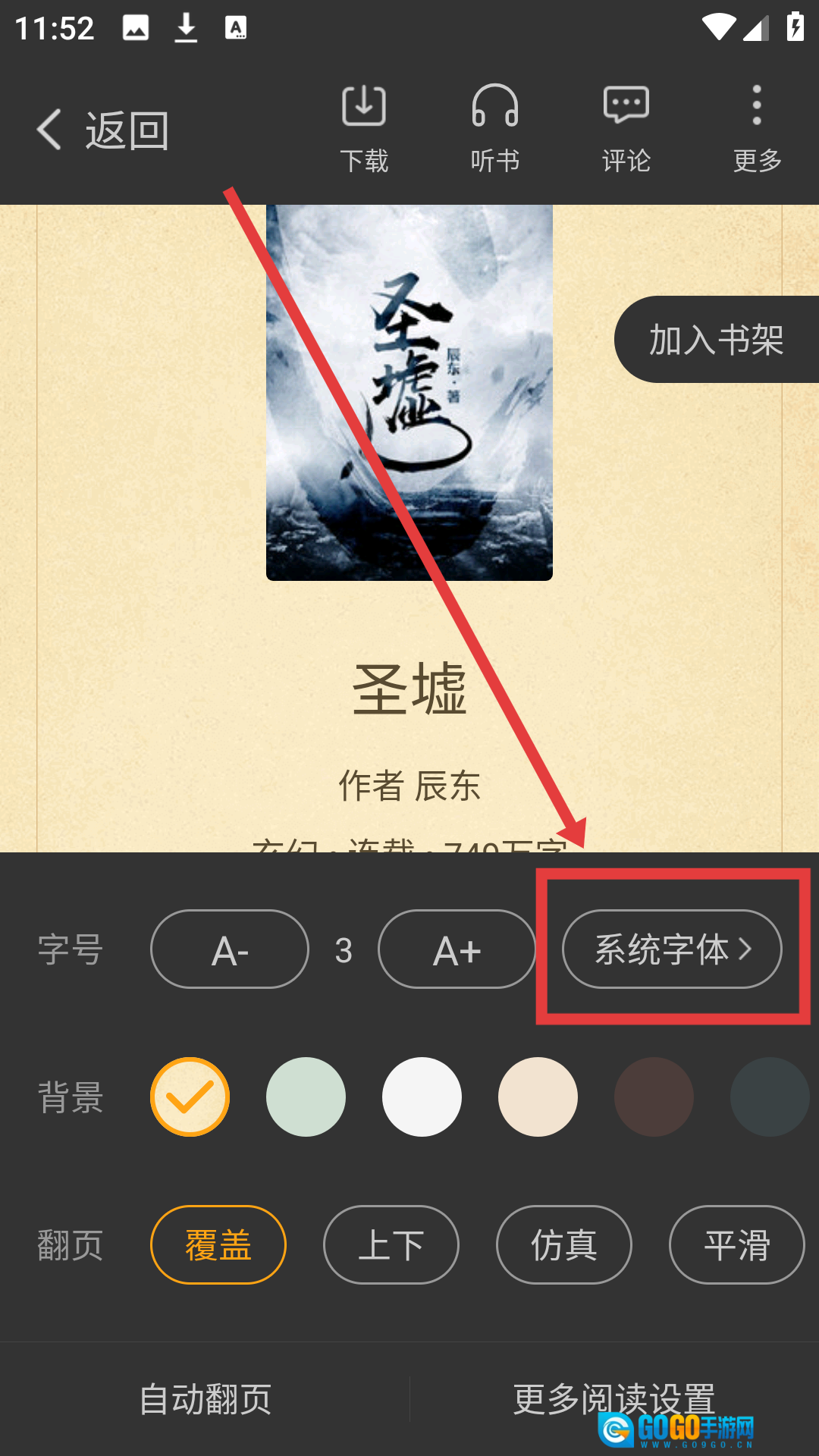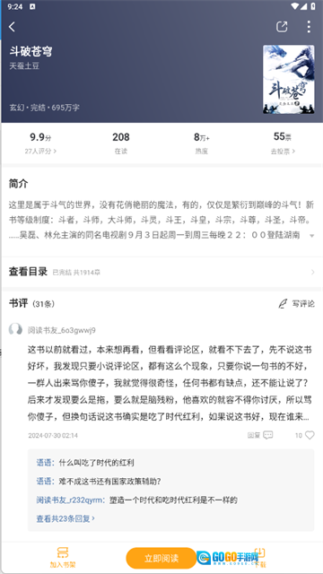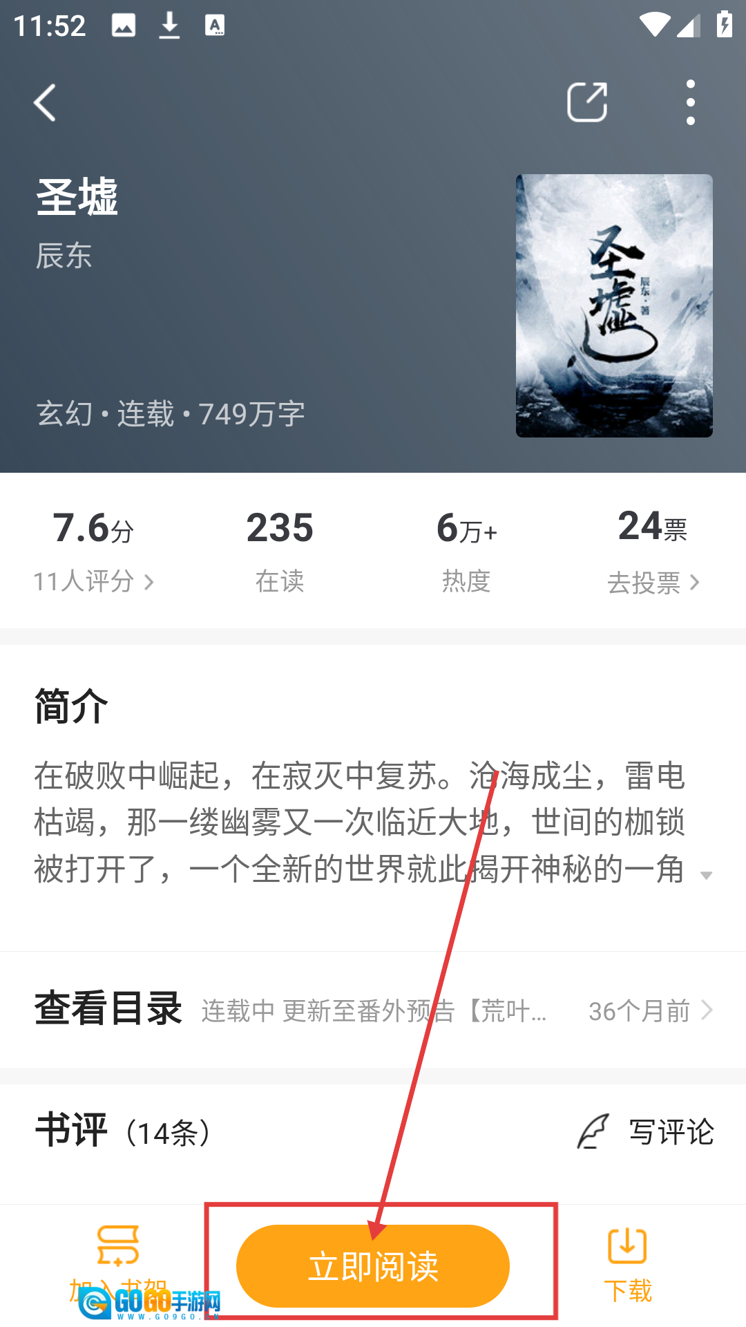 在《圣墟》的详情页面,点击【立即阅读】按钮,就可以开启这段玄幻阅读之旅了。