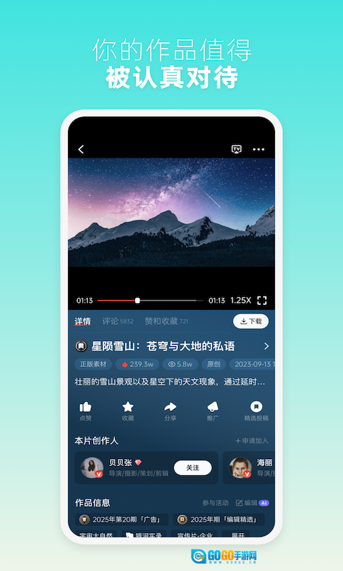 1、新片场的视频素材板块允许创作者上传影视短片、广告片、纪录片等各类作品,还能补充创作说明与技术参数,进而获取行业内专业人士的点评和反馈。