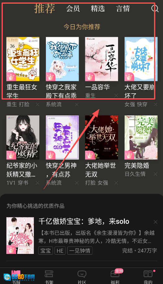 找书时可以多留意首页的推荐区域,这里的每本书都带有重生、打脸这类清晰的标签,能帮你更快找到自己偏好的题材风格。