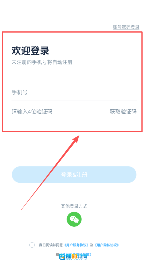1、第一步是完成登录注册流程,打开软件后选择账号密码登录的方式,同时勾选同意用户服务协议、隐私政策等相关选项,在此之前建议先认真阅读协议的具体内容。