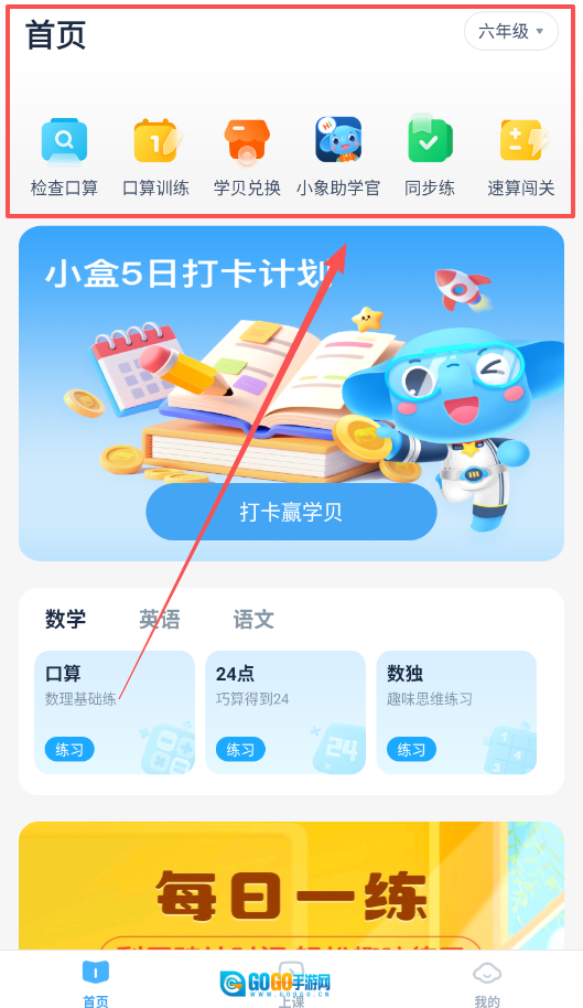 2、接下来可以探索首页的学习功能,在六年级主页能找到检查口算、口算训练等核心工具,每日一练模块也记得要打卡哦。