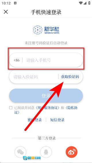 3、在登录页面,输入手机号后,点击获取验证码。