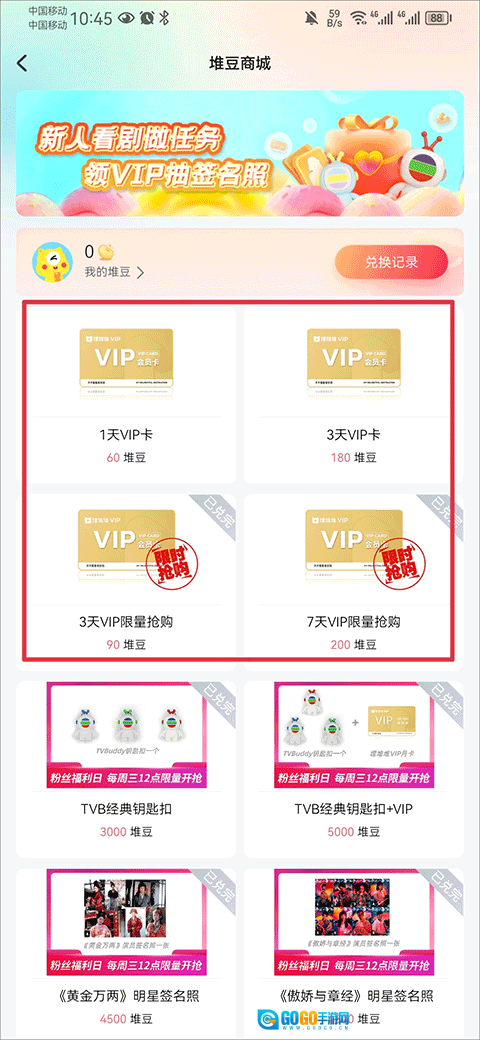 在堆豆商城页面,你能使用堆豆免费兑换1天、3天或7天的VIP卡,兑换所需的堆豆可通过点击页面上方的“新人看剧做任务”获取。