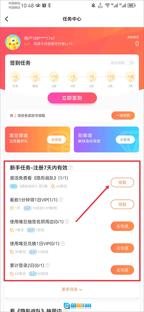 3、进入任务中心后,依据要求完成指定任务,就能获得堆豆奖励。