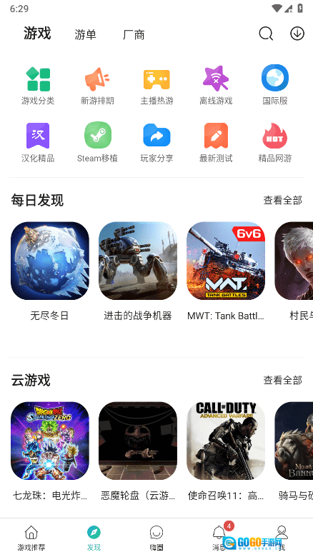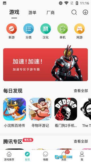 2、发现界面里有不少新游、分类游戏和游戏专题。