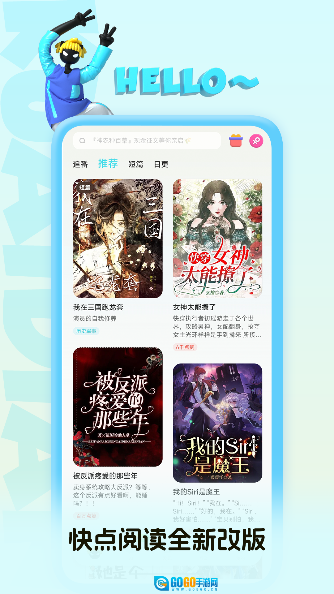 1、快点阅读让用户在这里看到很多有趣的电子书作品,每个用户都可以在这里看到自己喜欢的书。