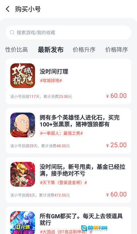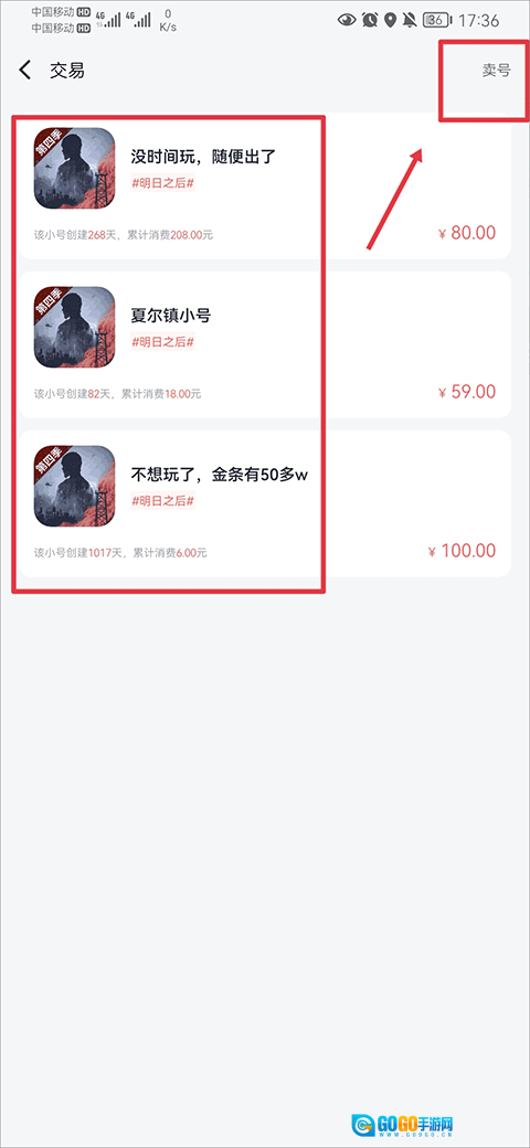 3、用户既可以在此处购买其他玩家出售的账号,也能点击右上角的“卖号”按钮来出售自己的游戏账号。