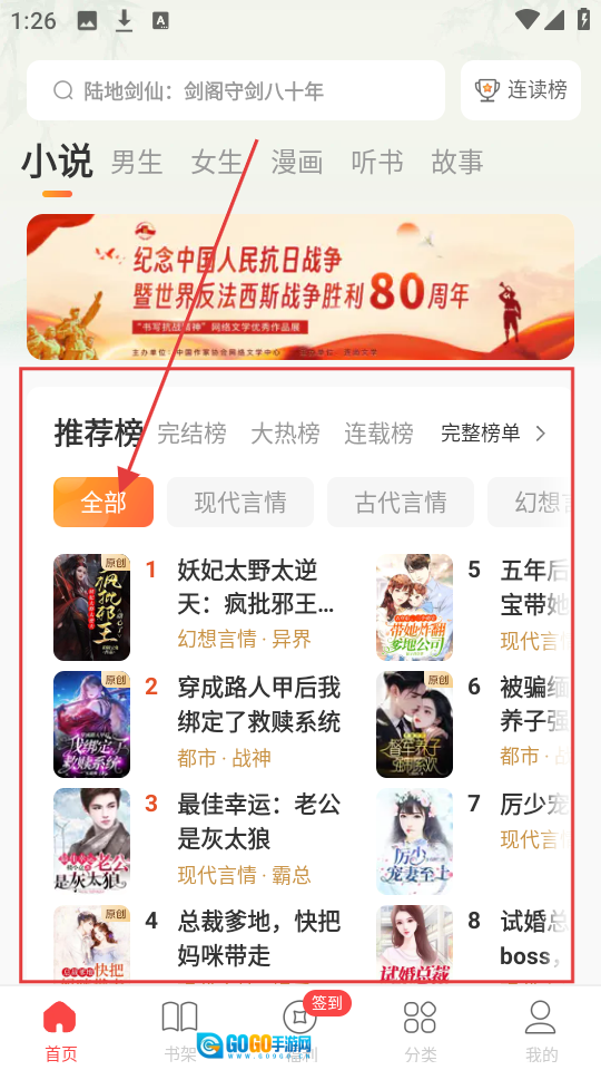 1、打开小说页面后,推荐榜单上陈列着不少小说,挑选一本你感兴趣的,点击该小说即可进入其详情页面。