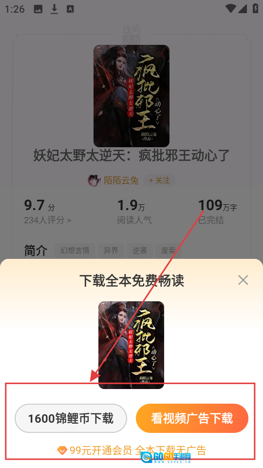 3、点击【全本】按钮后,页面会弹出获取方式的选项,你可以选择消耗【1600锦鲤币】直接解锁,也可以选择【观看视频广告】来免费获取,选好对应的方式就能完成解锁啦。