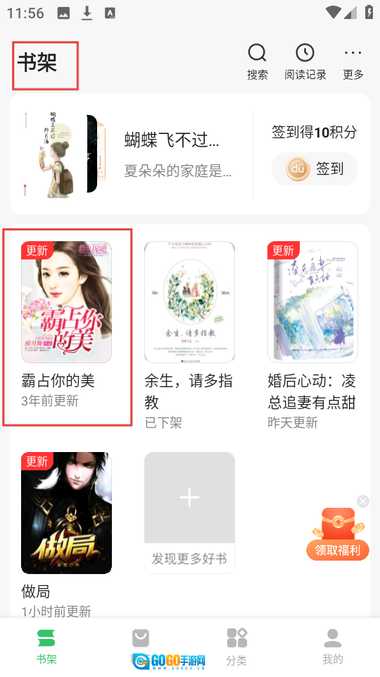 4、点击【书架】,就能看到添加的《霸占你的美》,快速进入阅读啦。