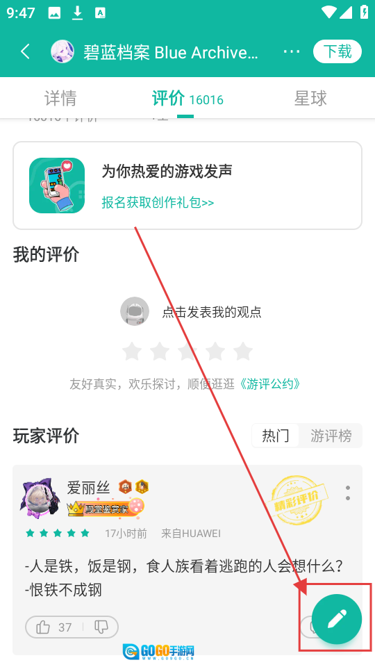 3、评价页点编辑图标,可发表游戏观点,是不是很赞呀。