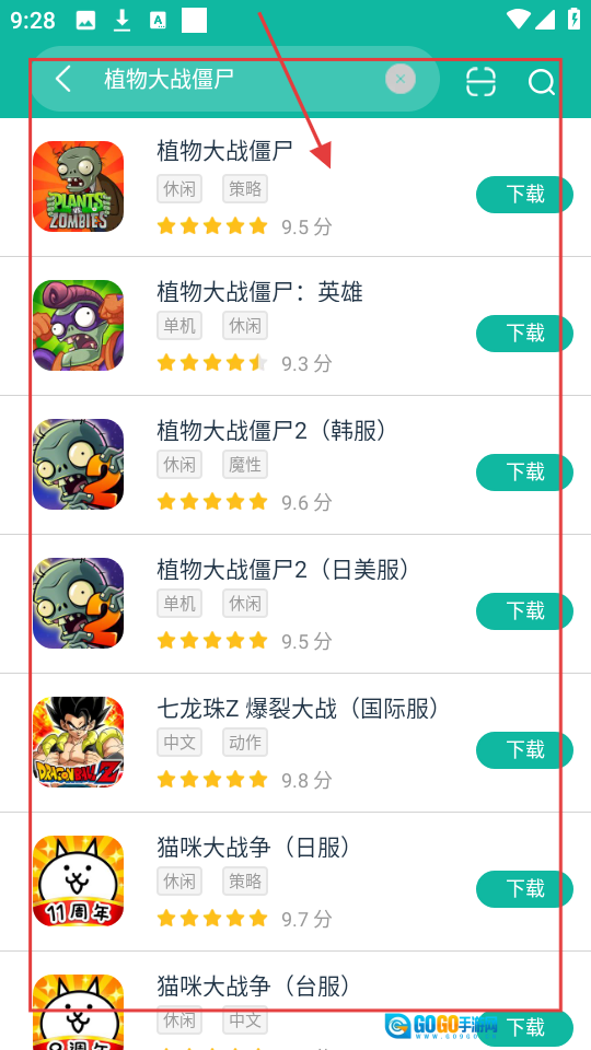 3、搜索结果页选《植物大战僵尸》,进入游戏列表,超简单呢。