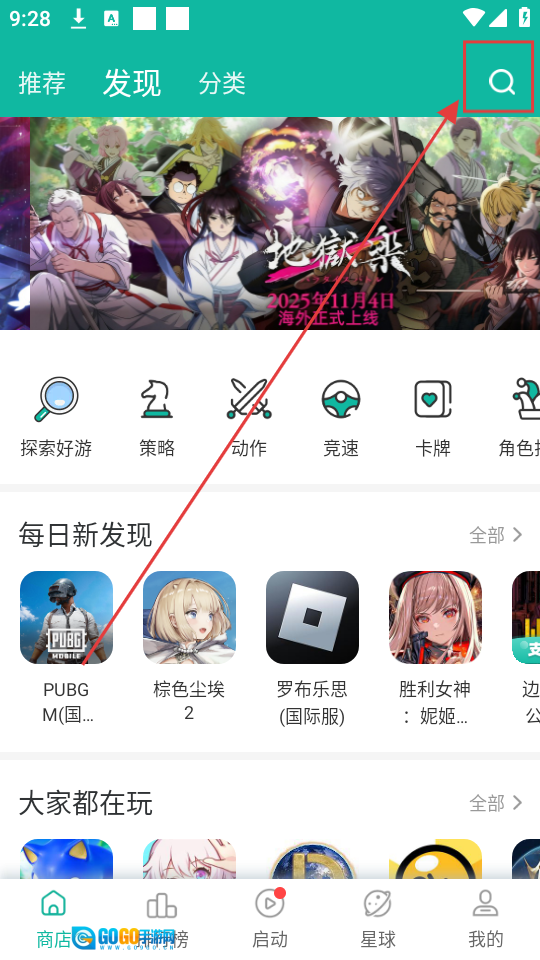 1、商店页点搜索图标,进入搜索页面,可找想玩的游戏哦。