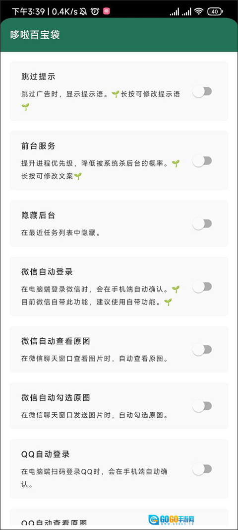 在这个哆啦百宝箱内我们可以设置跳过提示、前台服务、qq自动登录等等的功能,我们只需要把功能后面的开关打开就可以了。