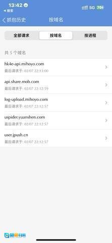 5. 随后回到stream界面,点击【开始抓包】按钮,接着返回【原神】应用,点击历史记录的下一页选项。 6. 再次回到stream,点击【结束抓包】,在历史抓包记录中找到对应的日期,然后选择【按域名】分类方式。
