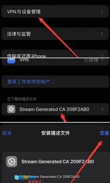 2. 按顺序在手机上操作:先安装CA证书,接着打开设置,找到***与设备管理选项,点击刚才的文件完成安装。