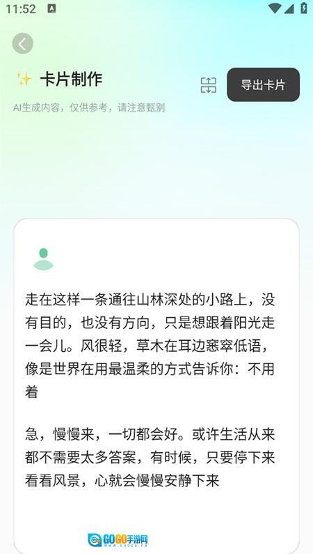 2、卡片创意设计:卡片创作功能可生成个性化图文卡片,适配社交媒体分享场景,增强内容吸引力。