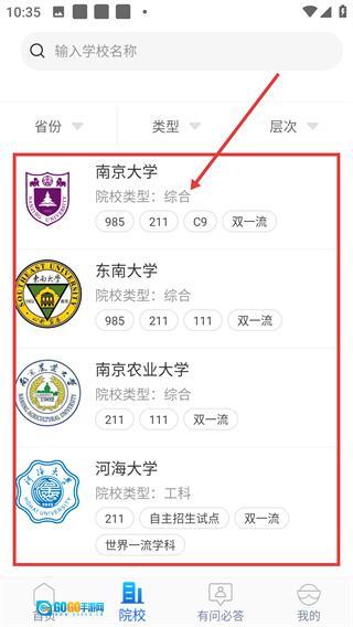 1、在首页,点底部的【院校】选项,可进入院校列表页面,查看各类高校的信息哦。