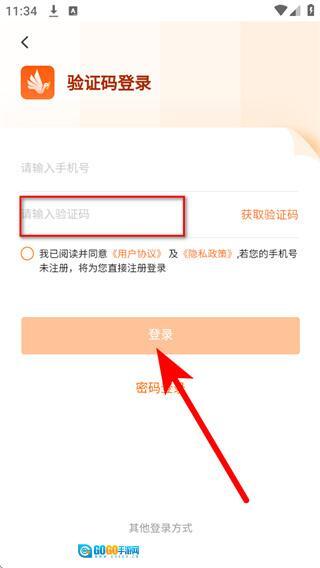 4、把收到的短信验证码填写到验证码输入框,勾选对应的相关协议,随后点击登录按钮,即可完成账号登录操作。