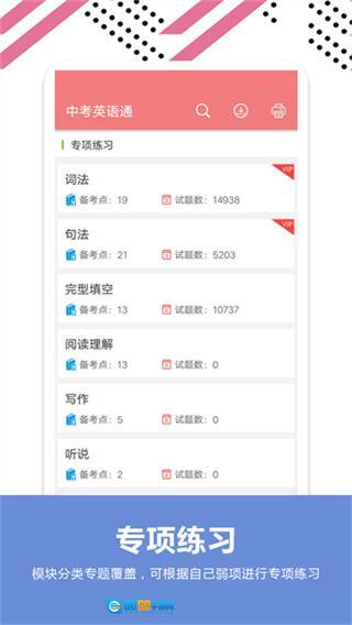 4、全类型用户需求精准适配,兼顾初三冲刺学生的真题演练需求、初一初二学生的基础夯实需求、教师的教学辅助需求、家长的辅导监督需求,满足不同人群的中考英语学习需求。