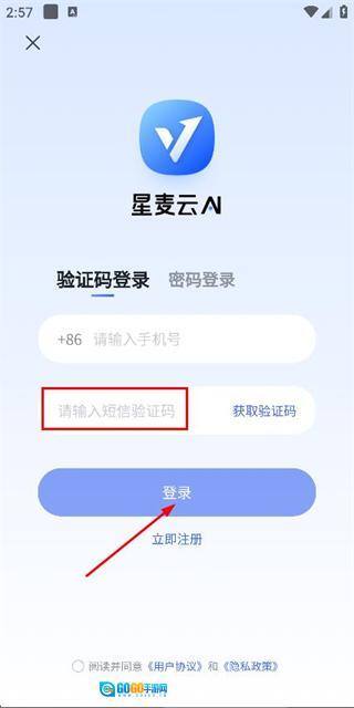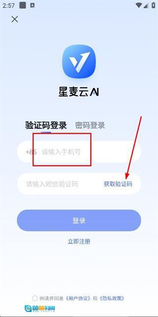 2、在登录页面填写手机号,勾选协议后,点击获取验证码。