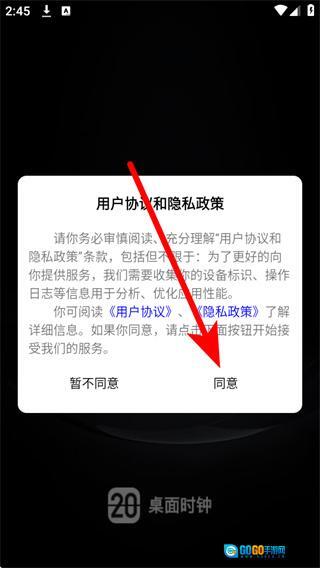 打开翻页桌面时钟应用后,会弹出一个弹窗,点击“同意”按钮,即可进入应用的主界面。