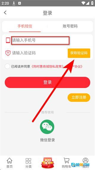 3、在手机短信登录页的手机号栏填写手机号码,接着点击获取验证码。