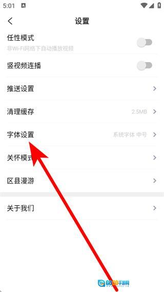 3、进入设置页面后,找到并点击字体设置选项,即可进入字体设置页面。