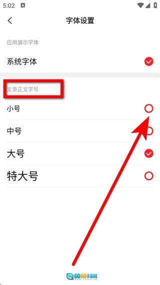4、进入字体设置页面后,点击文章正文字号选项,即可完成资讯阅读字体大小的调整。