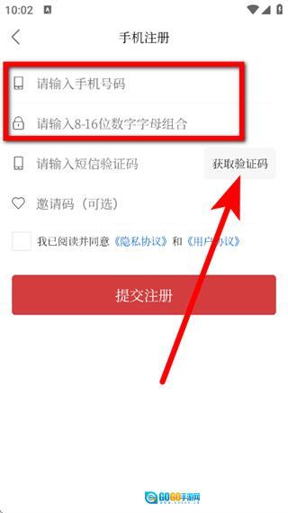 3、进入手机注册界面后,填写手机号码,设置登录密码,接着点击“获取验证码”按钮。