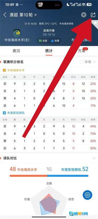 3、在赛事详情页的右上角,找到分享图标并点击,弹出分享选项菜单。