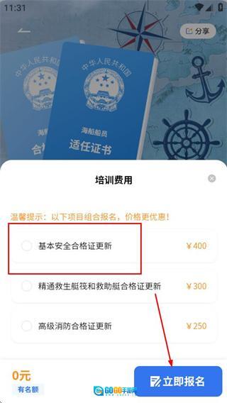4、在课程详情页面,点击“立即报名”按钮,即可进入培训费用选择页面。